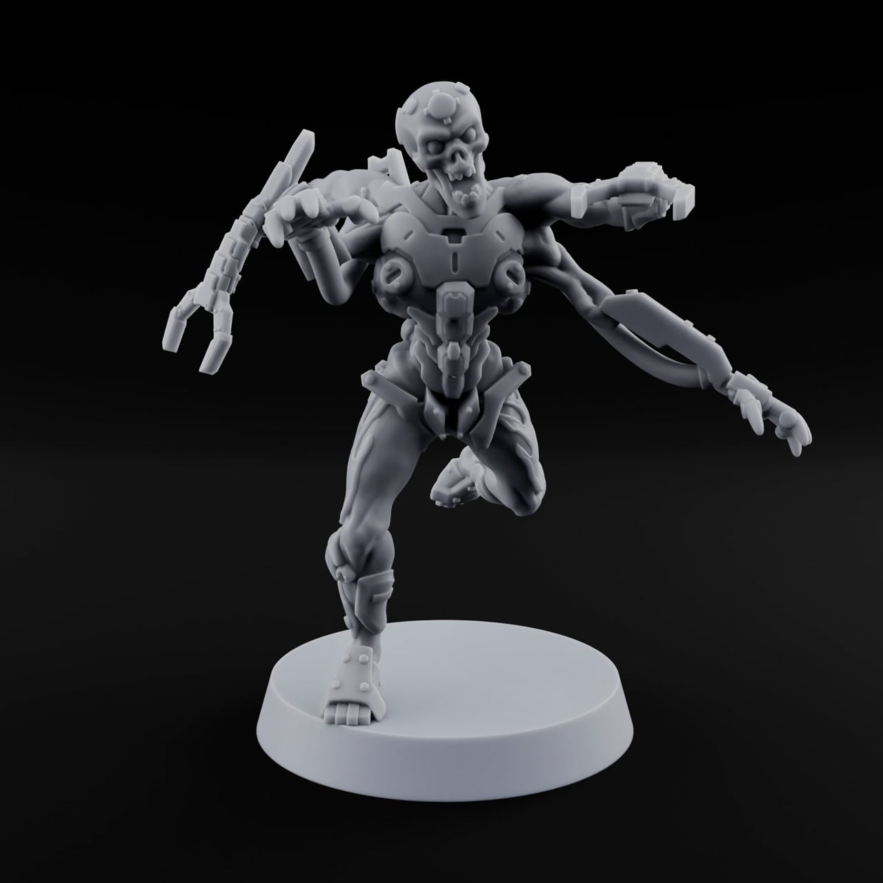 A skeletal death machine surges forward on mechanized legs, its decayed skull locked in a permanent snarl as four articulated limbs reach out to rend and tear. Armored plating fused to exposed musculature tells the story of flesh consumed by technology, while every servo joint and segmented claw is rendered in razor-sharp detail that demands attention on any tabletop. Deploy this relentless construct as a cybernetic enforcer in your Cyberpunk RED campaign, a malfunctioning war machine in Starfi