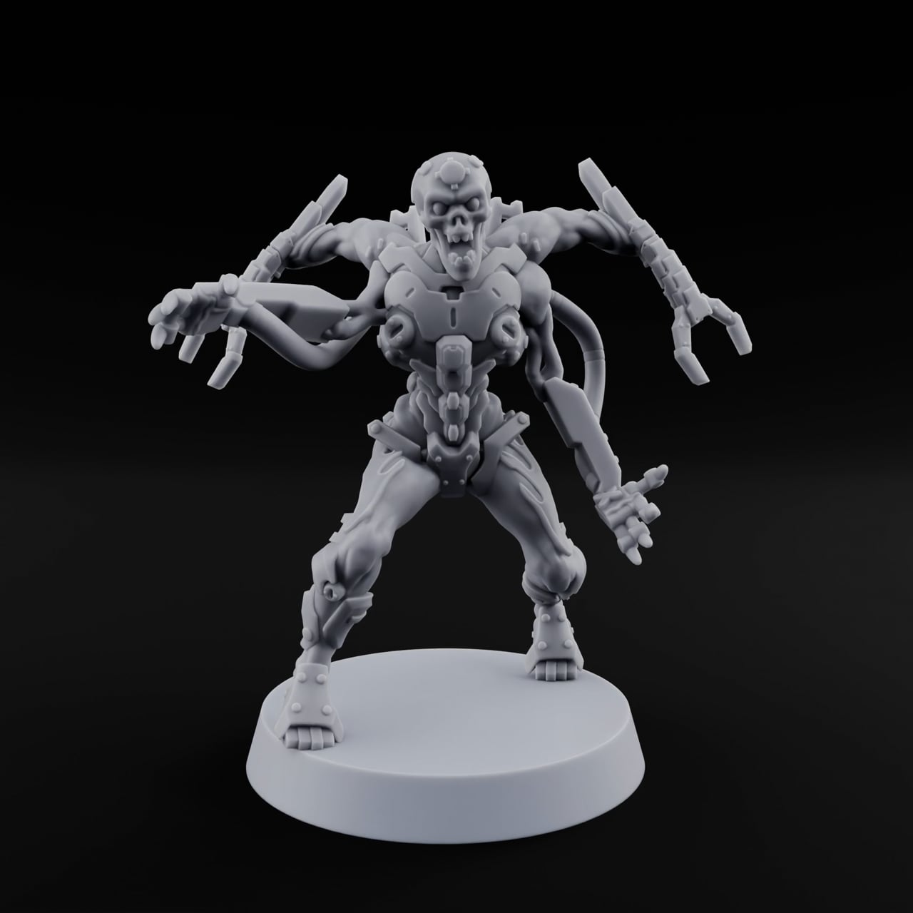 Something terrible has been done to this thing, and it wants you to know. The Terminating Cyborg Warrior stands wide-legged and aggressive, four articulated cybernetic limbs splayed outward like a predator mid-pounce. Its death's-head face — half skull, half machine — gapes in a permanent scream, while every inch of its augmented frame bristles with pistons, plating, and cruel mechanical fingers. The sculpt captures nauseating detail in every exposed servo and fused bone joint, giving this const
