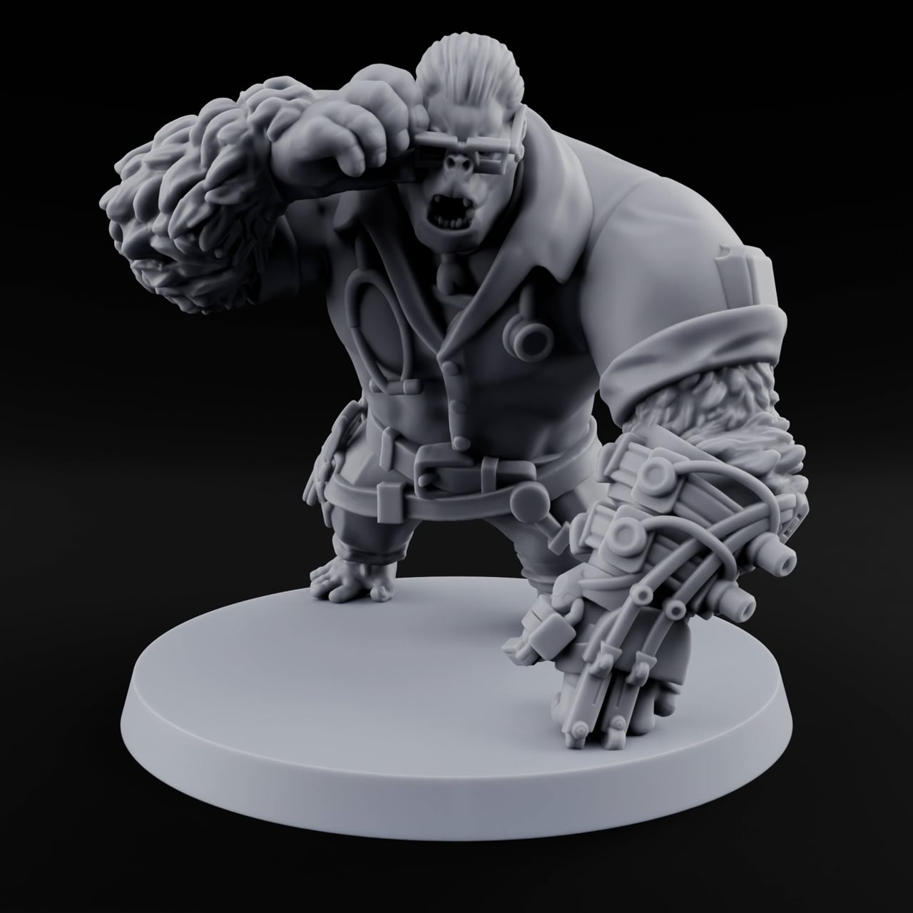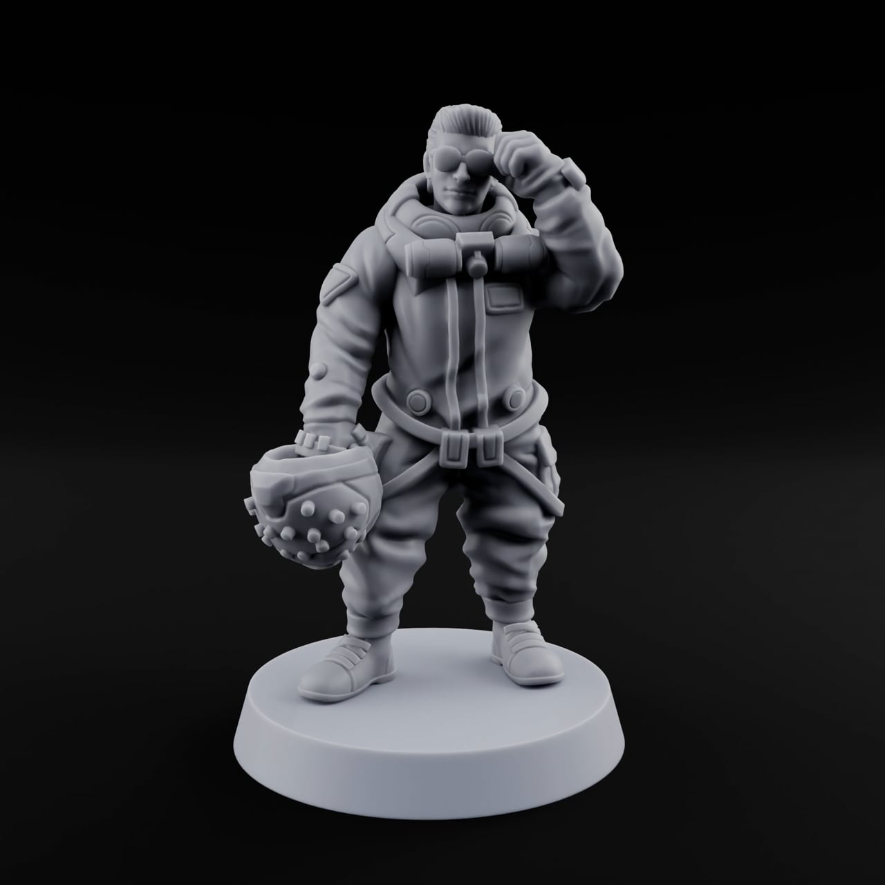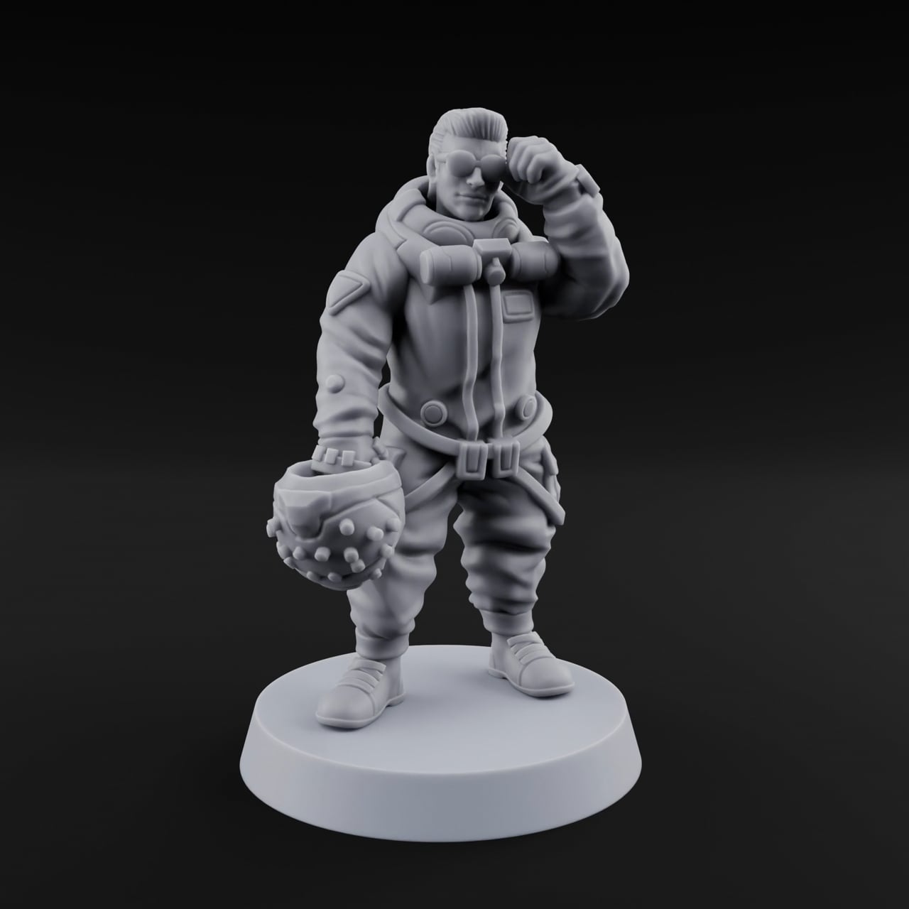Val stands with the easy confidence of someone who's never lost a bar fight. Slicked-back hair, tinted shades, and a cocky grin set the tone — this is a man who enjoys his work. One meaty hand grips a brutal studded gauntlet while the other adjusts his goggles with casual menace. Every buckle, strap, and crease on his heavy flight jacket is rendered in razor-sharp detail, giving the sculpt a tactile, lived-in quality that painters will love to explore. Whether he's the hired muscle in your Cybe