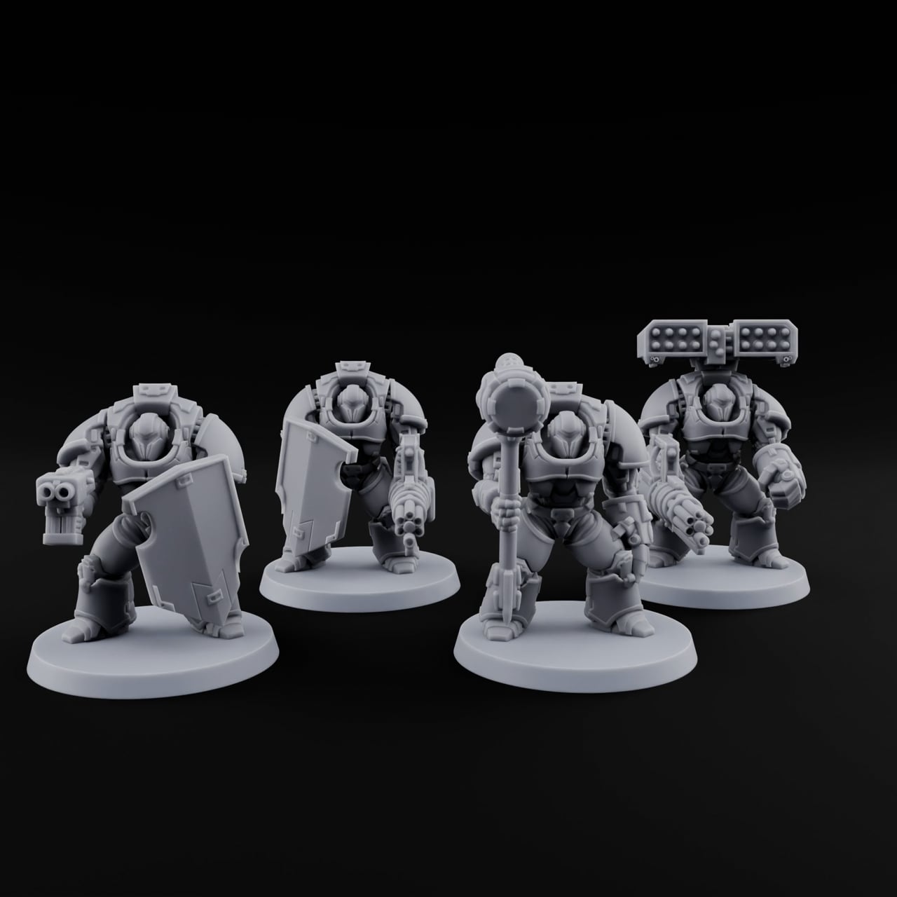 Encased in hulking powered armor and bristling with devastating ordnance, these Tormentors are built for one purpose: total annihilation. Each suit features a shoulder-mounted missile rack, a multi-barreled rotary cannon in one fist, and a heavy mechanized power gauntlet in the other — all rendered in razor-sharp mechanical detail that rewards close inspection. Their faceless, slit-visored helms radiate cold, relentless menace, and the broad-shouldered silhouette commands instant attention on an