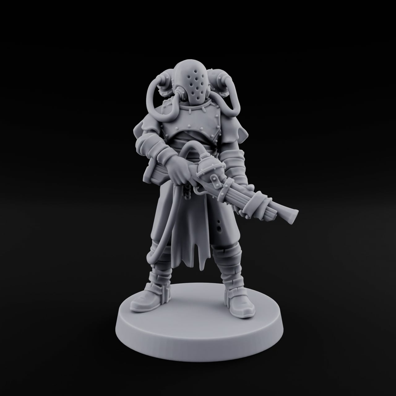 Wreathed in tattered coattails and riveted plate, this augmented artificer grips a cobbled-together firearm with the calm assurance of someone who built it from salvage and spite. Tubes snake from a bulky respirator helmet into reinforced armor plating, every rivet and hose rendered in razor-sharp detail that rewards close inspection. The wide combat stance and forward-angled posture radiate quiet menace — a figure that has long since traded humanity for something more efficient. Deploy this un